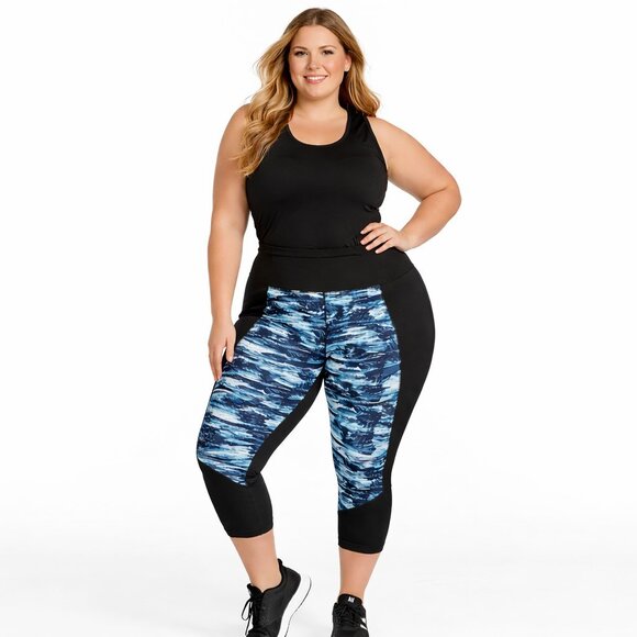 These Livi Active women plus size leggings feature a flattering 7/8 capri length with stretch performance fabric designed for comfort and movement. The black base with blue multi-pattern panels adds a modern athletic look ideal for workouts, athleisure, or casual wear. A reliable choice for those seeking quality plus size activewear, these Livi Active leggings offer both style and function. The flexible fit, trusted brand, and versatile design make them an easy addition to any workout or everyday wardrobe.