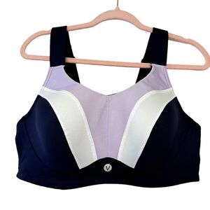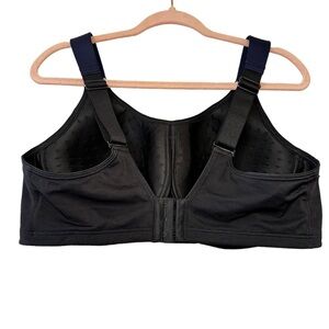 Adjustable, foam-lined straps for comfort support. Molded cups for full coverage support. Underwire support. Plush brushed-elastic bottom band. Laminated design at neckline with elastic bonded interior for extra bounce control. Convertible straps can be worn cross-back. Double-layer power mesh at back wing for breathable support. Cushioned closure.