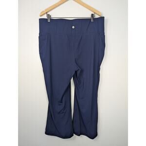 Livi Lane Bryant High Rise Wicking Capri Flare Legging in Pantone Maritime Blue. Has a wide 4" elastic waistband, pockets on sides.