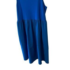This is a vibrant cobalt blue dress from the LIVI for Lane Bryant collection. Perfect for warm weather, it features adjustable spaghetti straps and a flattering empire waist that flows into a full skirt. The material appears to be a comfortable, smooth knit or woven fabric, likely polyester or a blend, offering great drape.