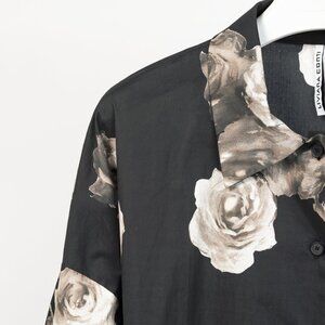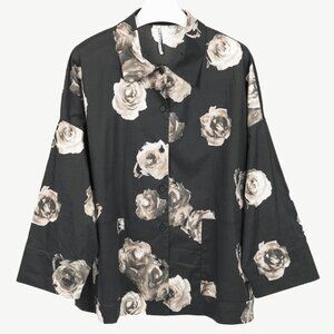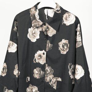 Made in Italy, this oversized shirt and jacket hybrid from Liviana Conti circa 2024 is crafted with a black cotton poplin printed in a grey floral, and features long sleeves, drop shoulders, a collared neckline, front button closures, and front patch pockets.