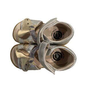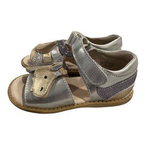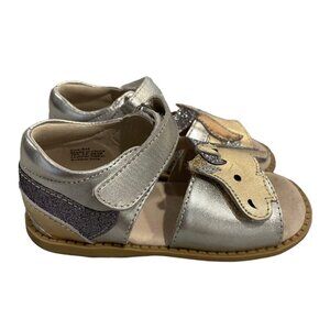 These precious Livie and Luca sandals feature a combination of silver, gold, and bronze metallic leather material. They have unicorn detail on the toe of each shoe and a hook and loop closure at the top of the foot. Size 8M