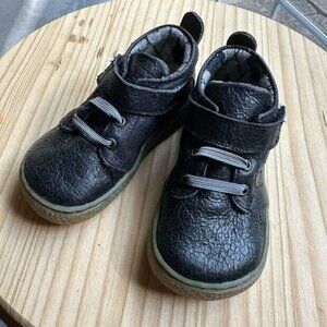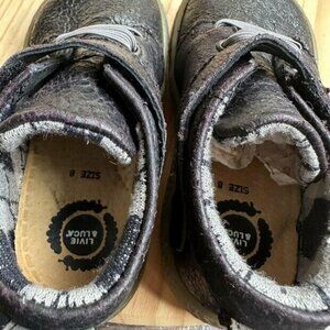 New, size 8. Black shoes, leather has a cool crinkled look. No tie, closure is hook & loop tabs and elastic. The honeycomb sole is the widest they offer, fits a foot size of about 6”, see size chart in photos or go to their website for a printable size chart. Ships in box, box has some damage.