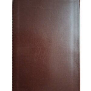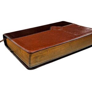 Very nice Living Bible with TuTone leather like cover and ribbon marker. This is a paraphrased bible making it easier to understand. Pre-owned, very good condition. Presentation page was torn out, binding is still very tight and unless you knew the page is supposed to be there, it is barely visible. The very back page has some notes on it (see picture), and the gold gilded page edges are a little worn and there appears to be a pen mark on the edges (see picture). Measures: 9" by 5 1/2" by 1 3/8" thick, weights 1 pound 12 ounces. Interested, make an o ffer. From a smoke and pet hair free home. Fast shipping.