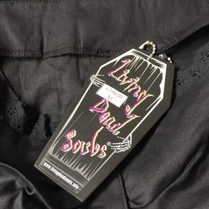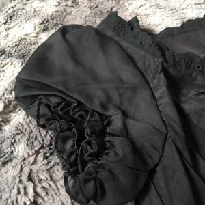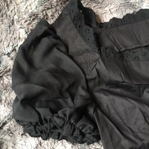 Adorable scoop neck blouse top with corset waist. Ruched bust and sleeves, lined with eyelet detail along neck. Front button closure.