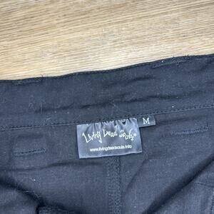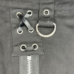 Edgy and rare Living Dead Souls black gothic mini skirt with major punk-rock attitude. Features dual front zippers, lace-up detailing, and silver-tone D-rings and snap cargo pockets. The heavy cotton twill gives it structure while maintaining comfort and movement. Perfect for fans of gothic, punk, or Y2K alternative fashion aesthetics.