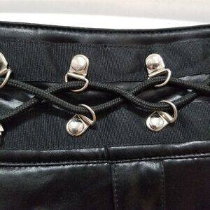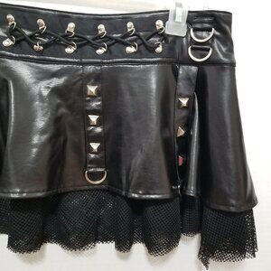 PVC manmade leather pleather micro mini skirt with pyramid spike studs, grommets, d rings, fishnet mesh tulle lace, & lace up detailing. Stretch. Hook & loop closure on side -- comes apart completely. Punk, mall goth, gothic, subculture, cosplay, metal, rockstar girlfriend, whimsigoth, scene kid, Y2K. This brand appears to have been discontinued well over a decade ago.