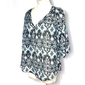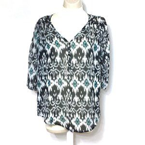 Living Doll Ikat Abstract Print Top Tunic Blouse Shirt M Black Blue White