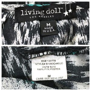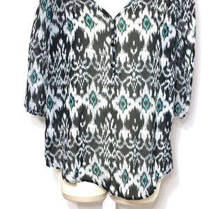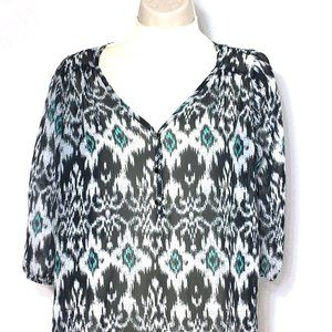 Living Doll; Womens; Tunic Top Blouse; Style # B1093Q445JD; Medium (M); Henley 3 Buttons V-Neck neckline; 3 Quarter (3/4) Sleeve; Black White Blue; Ikat print; Polyester; Great pre-loved condition. No holes, stains, or rips
