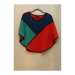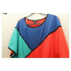 Block colored. Closed sides. Pancho cut rounded bottom. Round neck. Coral, aqua and blue on front, same coral on back. Tags still on.