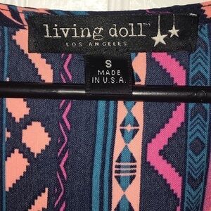 Pre-loved excellent condition Living Doll V-Neck long sleeve vertical Aztec design romper shorts with ruffles size small. Made in the USA.