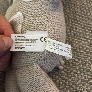 Living Textiles Knitted Theodore Elephant Toy. This adorable knitted elephant plush toy comes in a soothing gray color and rattles when shaken. Perfect for cuddling and playtime.