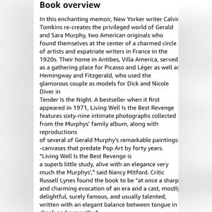 In this enchanting memoir, New Yorker writer Calvin Tomkins re-creates the privileged world of Gerald and Sara Murphy, two American originals who found themselves at the center of a charmed circle of artists and expatriate writers in France in the 1920s.