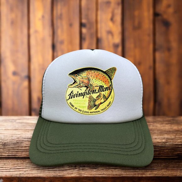 Livingston Montana Fisherman's Paradise Mens Trucker Hat Olive Snapback Trout