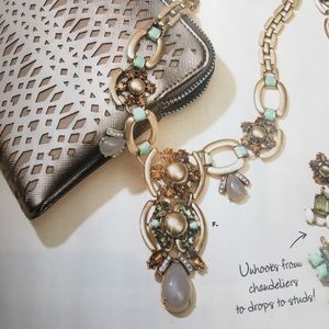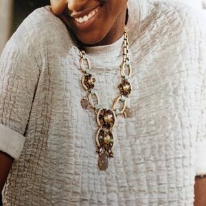 Gold "Y" silhouette with hints of mint enamel and cognac sparkle on a smooth chain with gold plating. Never worn with original box.
