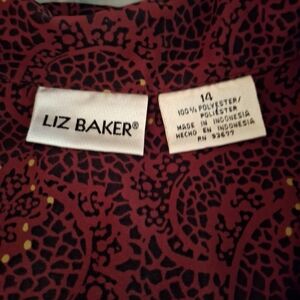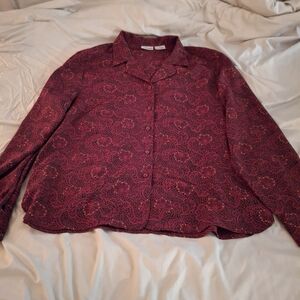 Elegant women's long sleeve red shirt with intricate black patterns. Ideal for versatile styling. By Liz Baker. size 14. pit to pit measures 22 inches. Length 26 inches.