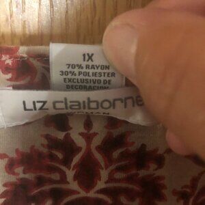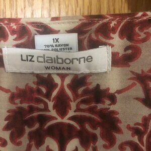 Liz Claiborne 1X Red/tan leaf style pattern blouse 3/4 length sleeve