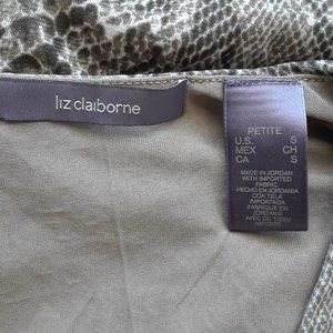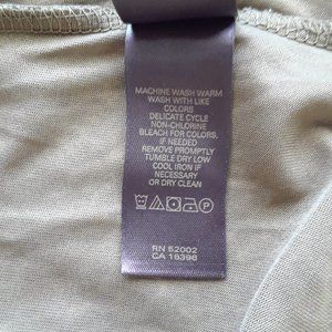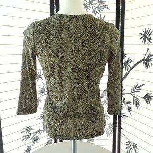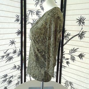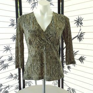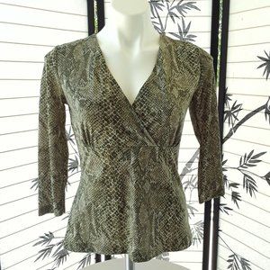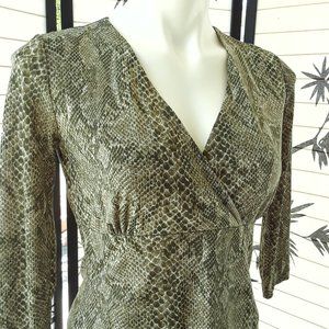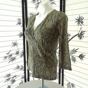 Features a wrap style v neckline and 3/4 length sleeves. Army green color print. Very flattering fabric with some stretch.