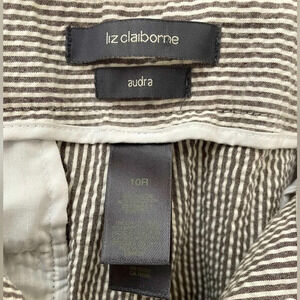 Liz Claiborne’s “Audra” 10R taupe & white textured ladies pants. Ribbon trimmed 2 slanted front pockets and 1 back pocket. 98% cotton 2% spandex. Waist closures are zipped button, hooks.