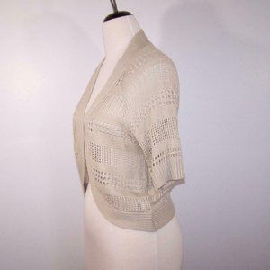 Elegant knit shrug with open front. Short sleeves and ribbed trim. Perfect for layering.