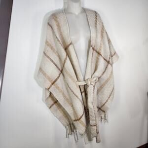 Liz Claiborne Belted Poncho Wrap Womens One Size OS Fringe Plaid Neutral Ivory