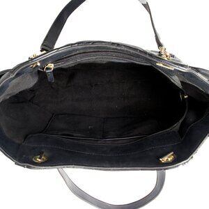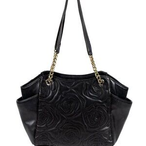 👛 Elegant black handbag with embossed rose design. Features gold chain accents. Perfect for any occasion.