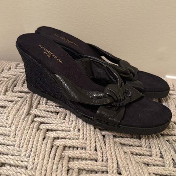 Liz Claiborne Black Leather Wedge Espadrille Open Toe Knot Sandals Women 6.5