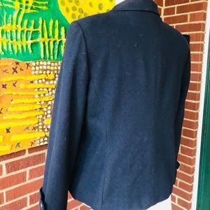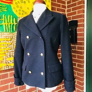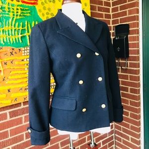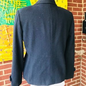 Liz Claiborne Wool Blend Black Pea Coat. It has LC adorable signature buttons. Fully lined. 97% wool and 3% other fibers. In excellent used condition. Size 4 Petite. Lovely to pair with ankle boots and skinny jeans.