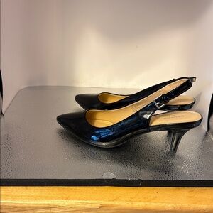 These classic black heels feature a sleek patent leather finish and a chic slingback design with an adjustable buckle. The pointed toe and kitten heel add a touch of elegance, making them perfect for professional and formal occasions.
