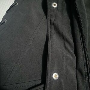 This elegant black trench coat by Liz Claiborne showcases a sleek, fitted design with unique lacing details on the sides for a customizable fit. The stand-up collar adds a sophisticated touch, making it a versatile piece for any occasion.