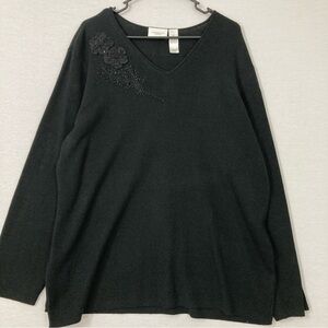 Liz Claiborne Black V Neck Floral Embellished Long Sleeve Sweater 2X