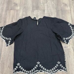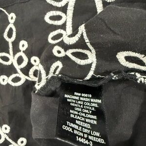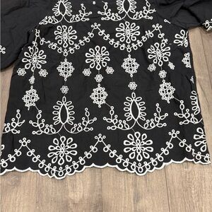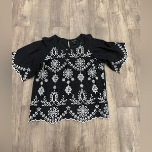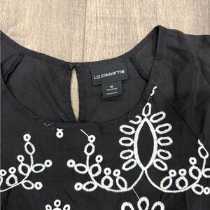 Elegant Liz Claiborne black top with intricate white embroidery. Perfect for a stylish and sophisticated look. Bell sleeves Size Medium