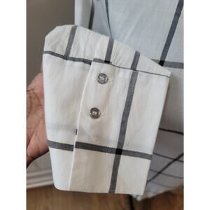 Liz Claiborne Career women’s blouse in size small is a stylish choice for work or casual wear. Featuring a white base with black windowpane plaid, it has chic bell sleeves and a relaxed fit. Crafted from a cotton rayon blend for softness and comfort, this versatile top pairs perfectly with skirts, trousers, or jeans. Easy to care for and wardrobe friendly.