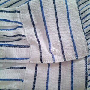 Classic and versatile! Like a "boyfriend shirt." Oversized, relaxed, blouse-y and "drape-y," this shirt is crisp and soft at the same time. The woven fabric is lightweight but has body to it - like a super soft "duck" cotton. Collared neckline, front buttons, chest pocket, and a relaxed high-low combo hem. Perfect for work, business casual outfits, hanging out "at the boat," or with a little bit of jewelry for weekend polish. White with navy blue stripes. Gently worn, in good condition. See photos for measurement of general idea of chest width, shirt length, and a close up of the lovely soft woven fabric of this.