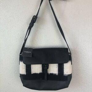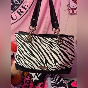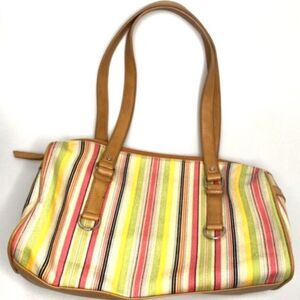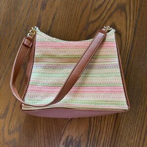 silver metal accents. Woven front panel.
