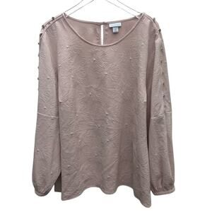 Liz Claiborne Blush Pink Knit Top. Dandelion Embossed Fabric. Button Trim at Shoulders. Size 3X. Pullover with back keyhole button closure. Balloon style sleeves with button cuffs. Gold-tone button trim at shoulders and halfway down sleeves. 4” bottom side slits. Polyester blend. Excellent preowned condition.