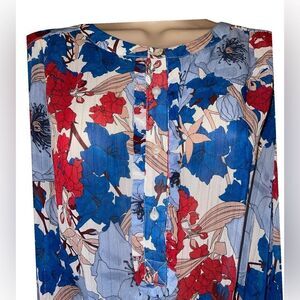 Liz Claiborne Boho Blue Floral Print Top Blouse Size L Glitter String Tie Front Like New