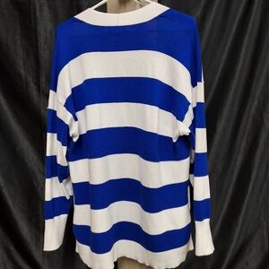This Liz Claiborne sweater features a striking blue and white stripe pattern, offering a relaxed fit with a classic relaxed fit . The knit material ensures warmth and comfort, making it a standout piece for casual wear.