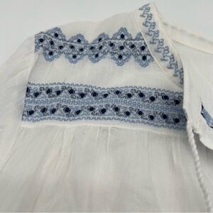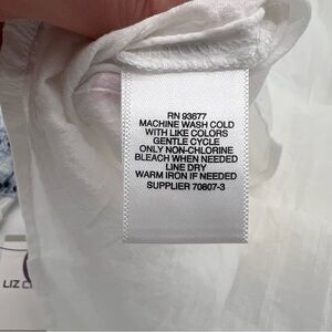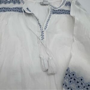 Upgrade your wardrobe with this Liz Claiborne Botanical Bliss Peasant Blouse in size XL. This lightweight, boho-inspired top features intricate blue embroidery on the neckline, shoulders, and sleeves, along with a flattering split neckline with tassel ties. Perfect for casual wear, vacation, or a relaxed, stylish look.