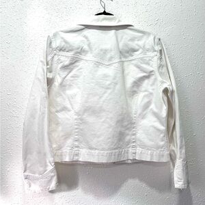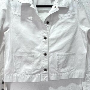 Chic 100% cotton white denim jacket with button closure. Features two front patch pockets and long sleeves.