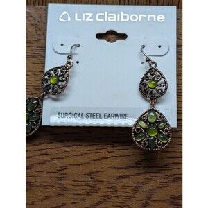 Liz Claiborne Bronze Tone Dangle Earrings Green Cabochons and Filigree Detail.