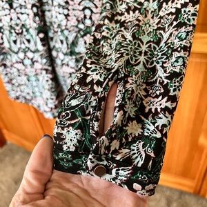 Liz Claiborne Career 1X Black Floral Blouse Shirt Crochet Tie Neck Long Length