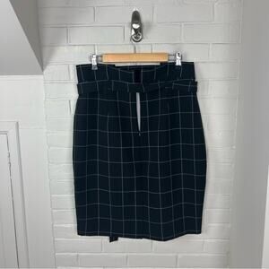 Good pre worn condition. Liz Claiborne career back and white windowpane pattern skirt. Has a slight Paperbag waist look to it with a fabric tie belt. Size 14. Zips down the back. All sales final.