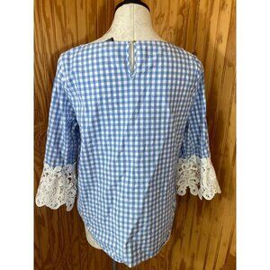 Liz Claiborne Career Blouse Pullover Top Keyhole Blue Checkered Cotton Sz M