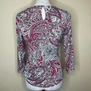Liz Claiborne Career Burgundy Paisley Pleated 3/4 Sleeve Blouse Top Shirt Small