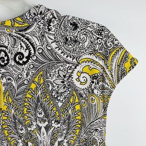 Liz Claiborne Career short cap sleeved top with a yellow, black and white abstract floral paisley print featuring a cinching at the center top of the rounded neckline, creating a nice cascading of fabric fully down the front. The back has a zipper with a yellow panel. The sleeves are short with a moderate capping.