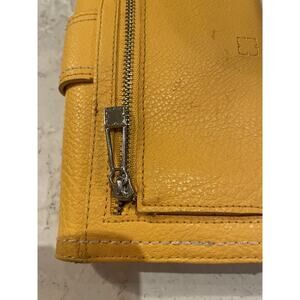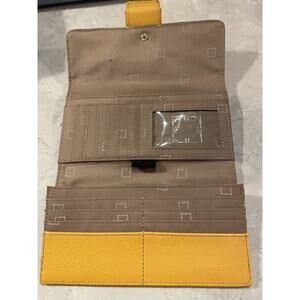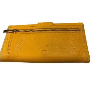 Liz Claiborne Checkbook Wallet Golden Yellow Pebble Grain Big Buckle Organizer . 15cc slots, one is slot, 3 bill slots and one outer zippered change pocket. There are a couple of flaws shown in last photos. Please look closely. It looks never used on the inside except for flaws. Preowned flaws