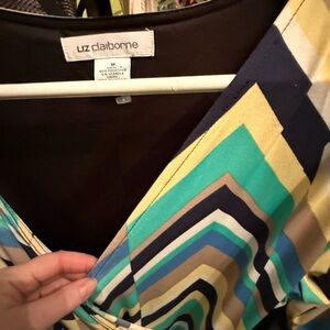 Stylish chevron wrap dress in vibrant blue, green, yellow, and black. Perfect for any occasion.