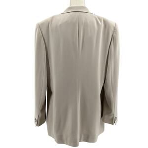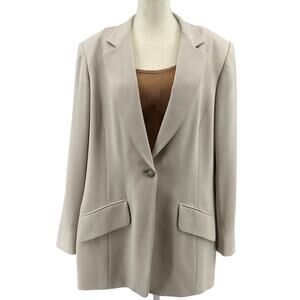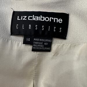 Command attention with timeless sophistication in this Liz Claiborne Classics pantsuit, size 14. In a neutral tan hue, this fully lined set features a long-sleeved blazer and matching coordinated trousers.