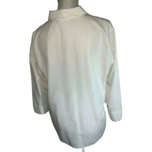 This relaxed cream blouse by Liz Claiborne features a classic dress shirt collar and 3/4 sleeves, offering a versatile and comfortable fit for any occasion.